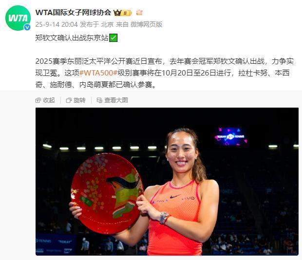 北京时辰9月14日晚,WTA官方发布音书,郑钦文已证据将出战2025WTA500东京站的比赛。