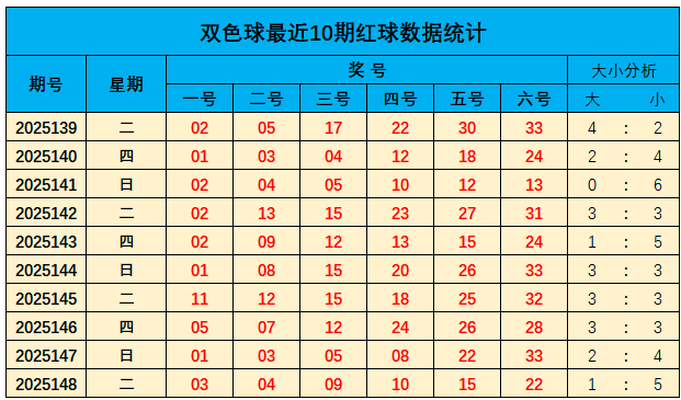 上期红球大小比为1:5,近10期大小比为22:38;总体上小奖号走势稍热,本期柔柔大数较上期走势升温,推选大小比为:3:3