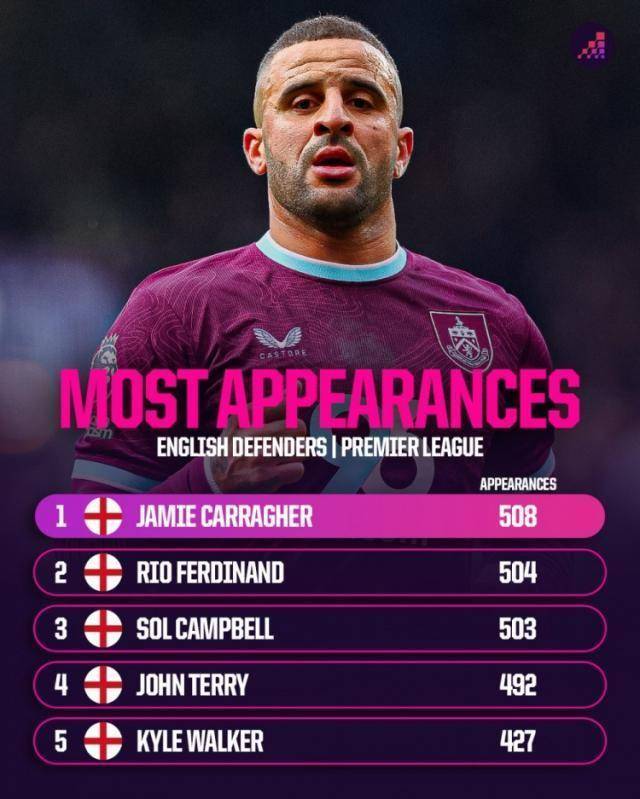 英格兰后卫英超出场榜:卡拉格508场居首,沃克427场第五